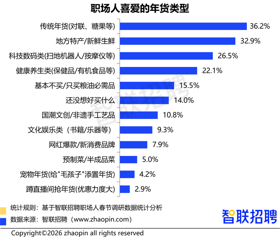 在年货选择上,36.2%的职场人将传统年货(对联、福字、糖果等)列为首选,凸显对传统文化的认同与坚守,贴福字、备年货的仪式感,仍是打工人心中“过年该有的样子”。同时,32.9%的人倾向选择地方特产、新鲜生鲜,年夜饭品质、地道美食受到越来越多人的追捧;另有26.5%的人会选购科技数码类产品(如智能手表、按摩仪等),既可为长辈送上贴心关怀,也能犒劳自己。