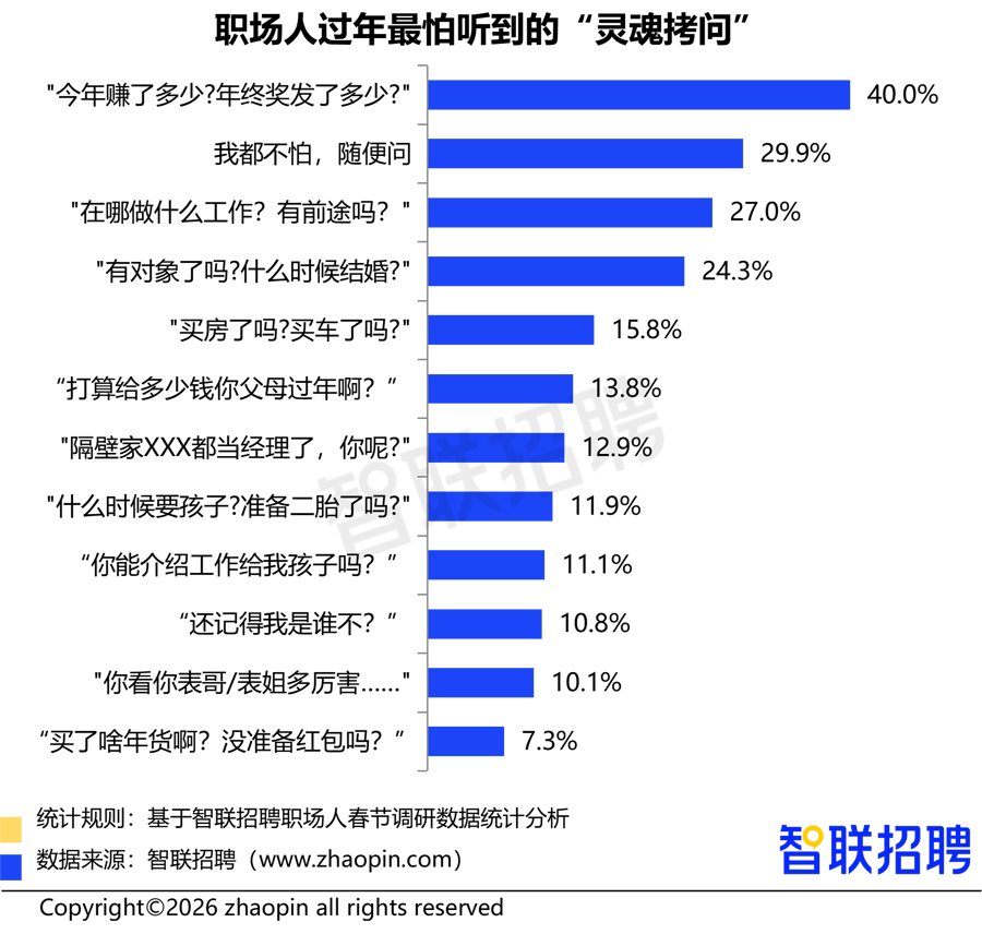 春节社交场合里,亲戚们的“灵魂拷问”是广大职场人躲不开的“劫”。各种“关心式拷问”中,40%的职场人直指“今年赚了多少?年终奖发了多少?”,成为头号“雷区”;紧随其后的是“在哪工作?做什么的?有前途吗?”;24.3%的人则对婚恋问题感到恐慌,“有对象了吗?什么时候结婚?”的质问如五雷轰顶。此外,买房买车、攀比式问候、“给父母多少过年钱”等道德绑架式提问也让不少职场人心生忌惮。不过,也有29.9%的职场人表示“随便问,无所畏惧”,展现出从容心态。