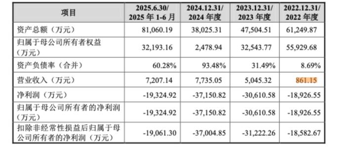 招股书显示,2022年至2025年上半年,其营收分别约861.15万元、5045.32万元、7735.05万元和7207.14万元;同期净亏损分别为1.89亿元、3.06亿元、3.72亿元,以及1.93亿元,三年半累计亏损超10.6亿元。