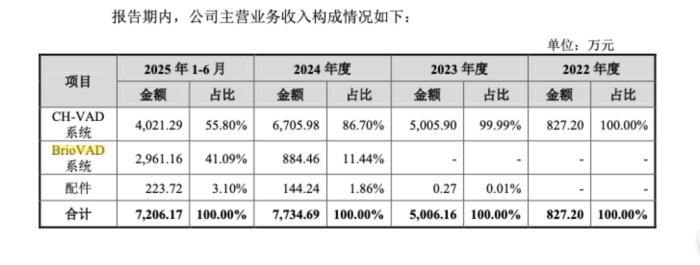 招股书显示,2022年至2024年,CH-VAD系统的主营业务收入从827.2万元增长至6705.98万元。2025年上半年,CH-VAD系统和BrioVAD系统(两者血泵相同)的主营业务收入分别为4021.29万元和2961.16万元,合计占整体营收的96.9%。