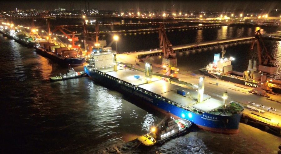 2月8日晚上9时许,上海港吴淞口岸的码头灯火通明,载运了近满船纸浆的“中远海运荣耀”轮,缓缓靠泊罗分码头5号泊位。