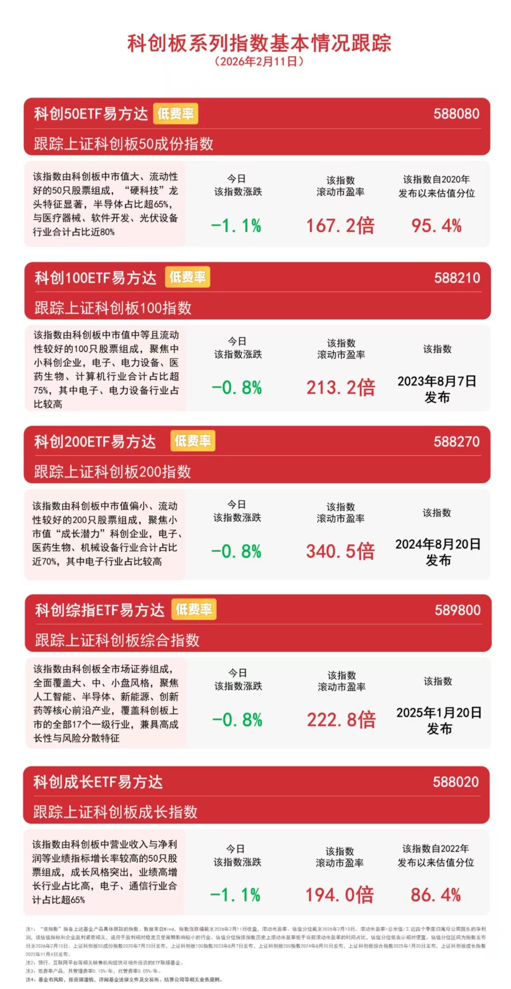 2月11日,盘面热点较为稀少,AI硬件方向局部活跃,机器人概念多数下跌。截至收盘,科创100指数、科创200指数、科创综指均下跌0.8%,科创50指数、科创成长指数均下跌1.1%。