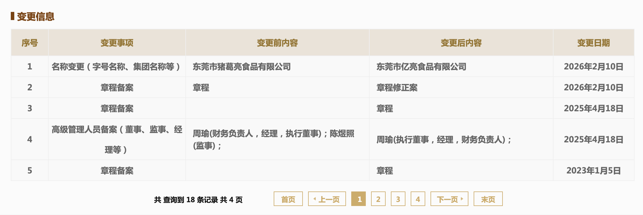 中新网2月11日电国家企业信用信息公示系统显示,近日,东莞市猪葛亮食品有限公司发生工商变更,企业名称变更为东莞市亿亮食品有限公司。该公司成立于2020年4月,注册资本200万人民币,由周瑜担任公司法定代表人、执行董事、经理、财务负责人,并由周瑜全资持股。
