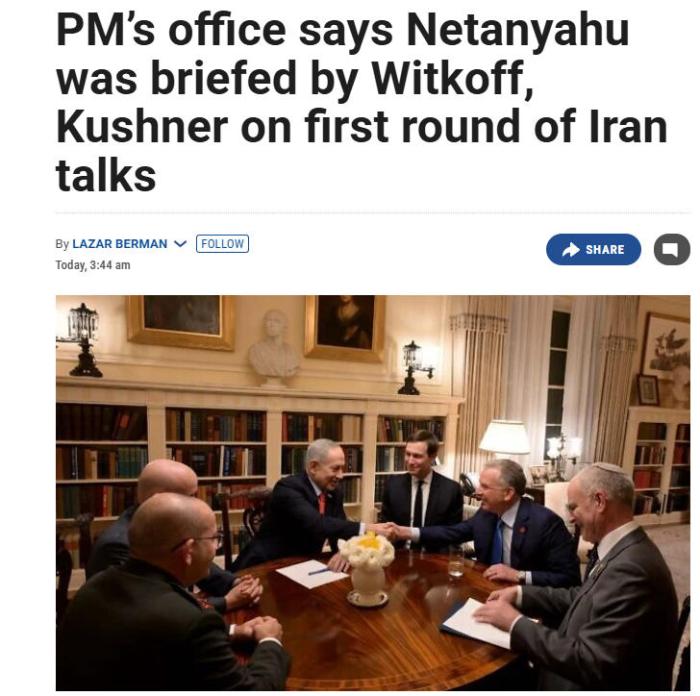 据《以色列时报》报道,以色列总理办公室称,威特科夫和库什纳向内塔尼亚胡通报了美国和伊朗在阿曼首都马斯喀特举行间接谈判的情况。