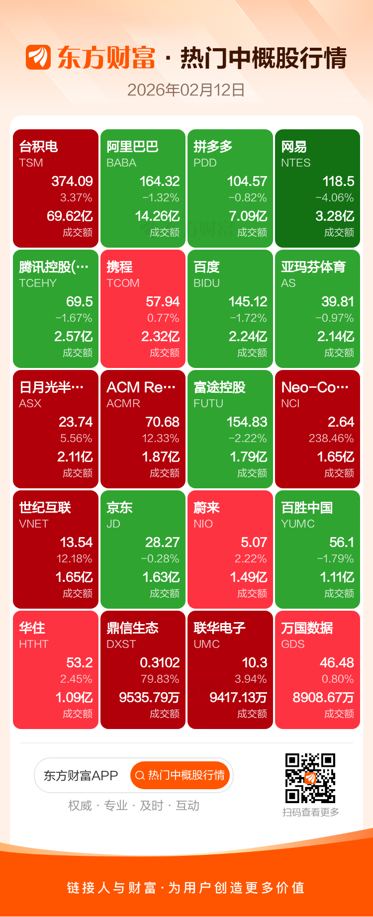 台积电涨3.37%,阿里巴巴跌1.32%,拼多多跌0.82%,网易跌4.06%,腾讯控股(ADR)跌1.67%,携程涨0.77%,百度跌1.72%,亚玛芬体育跌0.97%,日月光半导体涨5.56%,ACM Research Inc-A涨12.33%。