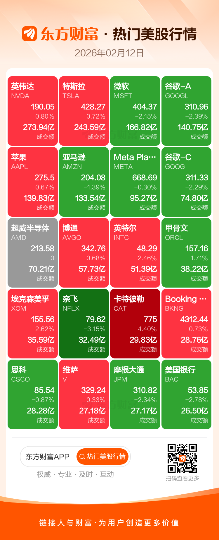 英伟达涨0.80%,特斯拉涨0.72%,微软跌2.15%,谷歌-A跌2.39%,苹果涨0.67%,亚马逊跌1.39%,Meta Platforms Inc-A跌0.30%,谷歌-C跌2.29%,超威半导体涨0.00%,博通涨0.68%。