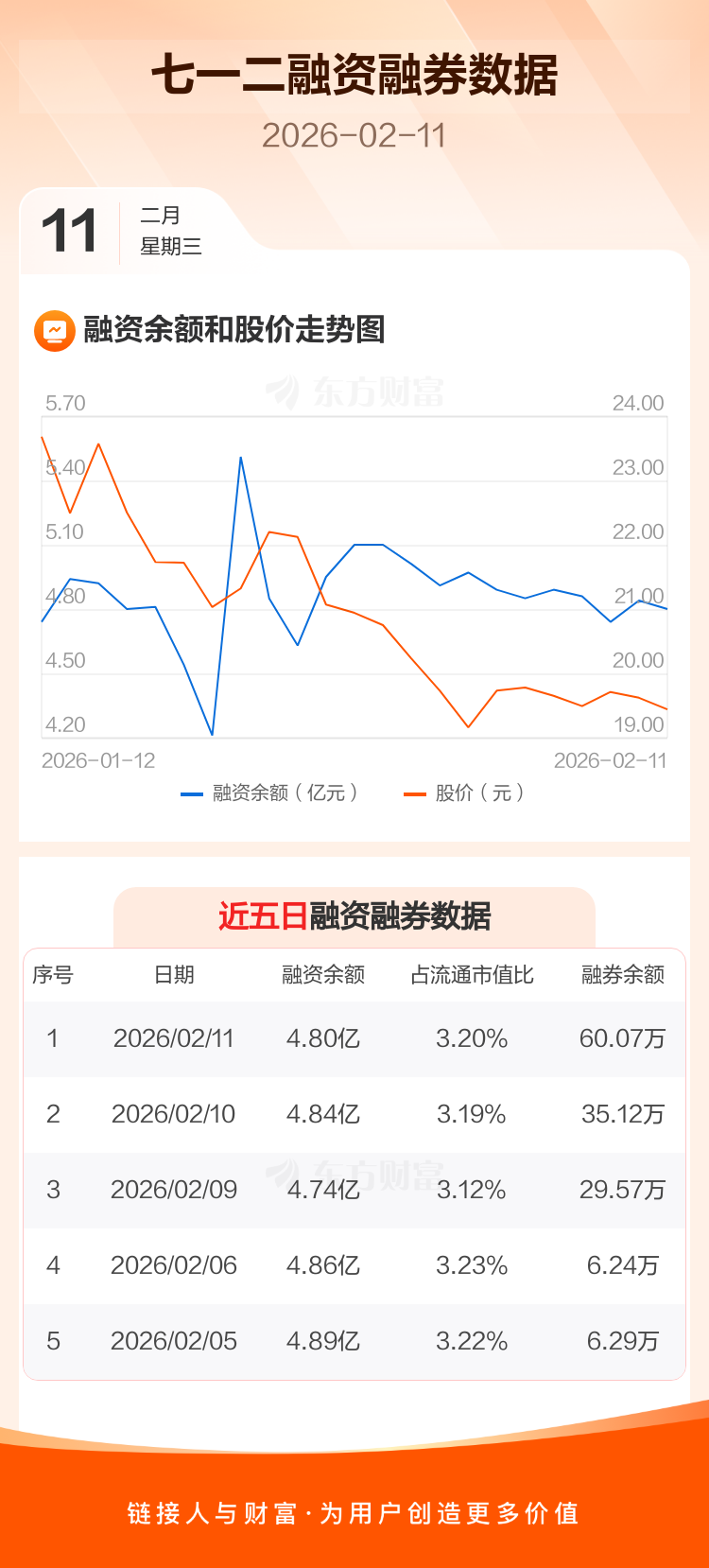交易所最新数据显示,七一二于2026年2月11日获融资买入1434.21万元,融资偿还1814.19万元,当日融资净偿还379.98万元。目前,该股融资余额4.80亿,占流通市值比例为3.20%。