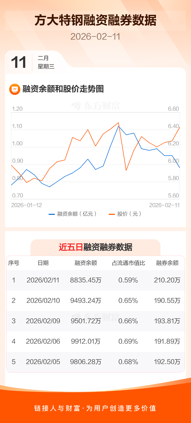 交易所最新数据显示,方大特钢于2026年2月11日获融资买入773.26万元,融资偿还1431.05万元,当日融资净偿还657.79万元。目前,该股融资余额8835.45万,占流通市值比例为0.59%。