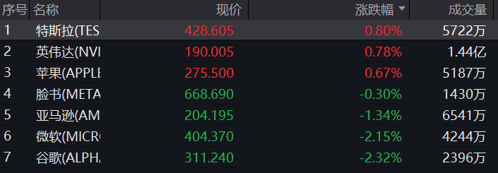 大型科技股涨跌互现,万得美国科技七巨头指数下跌0.57%。个股方面,谷歌、微软跌超2%,亚马逊跌逾1%,脸书跌0.3%,英伟达涨0.78%,特斯拉涨0.8%,苹果涨0.67%。