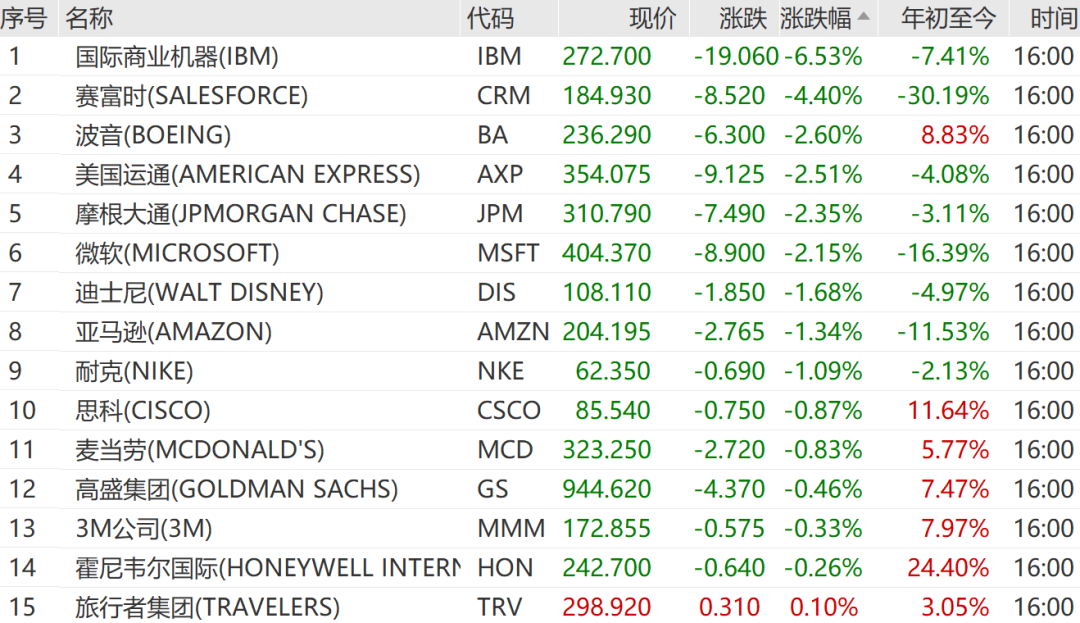 IBM跌6.53%,赛富时跌4.40%,波音跌2.60%,领跌道指成份股。