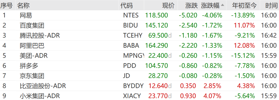 中概股多数下跌,纳斯达克中国金龙指数跌0.65%,万得中概科技龙头指数跌0.98%。