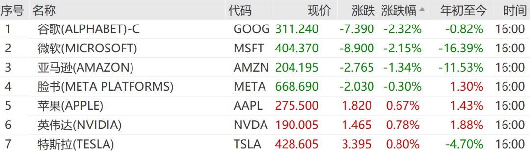 大型科技股涨跌互现,万得美国科技七巨头指数下跌0.57%。个股方面,谷歌、微软跌超2%,亚马逊跌逾1%,脸书跌0.3%,特斯拉涨0.8%,英伟达涨0.78%,苹果涨0.67%。