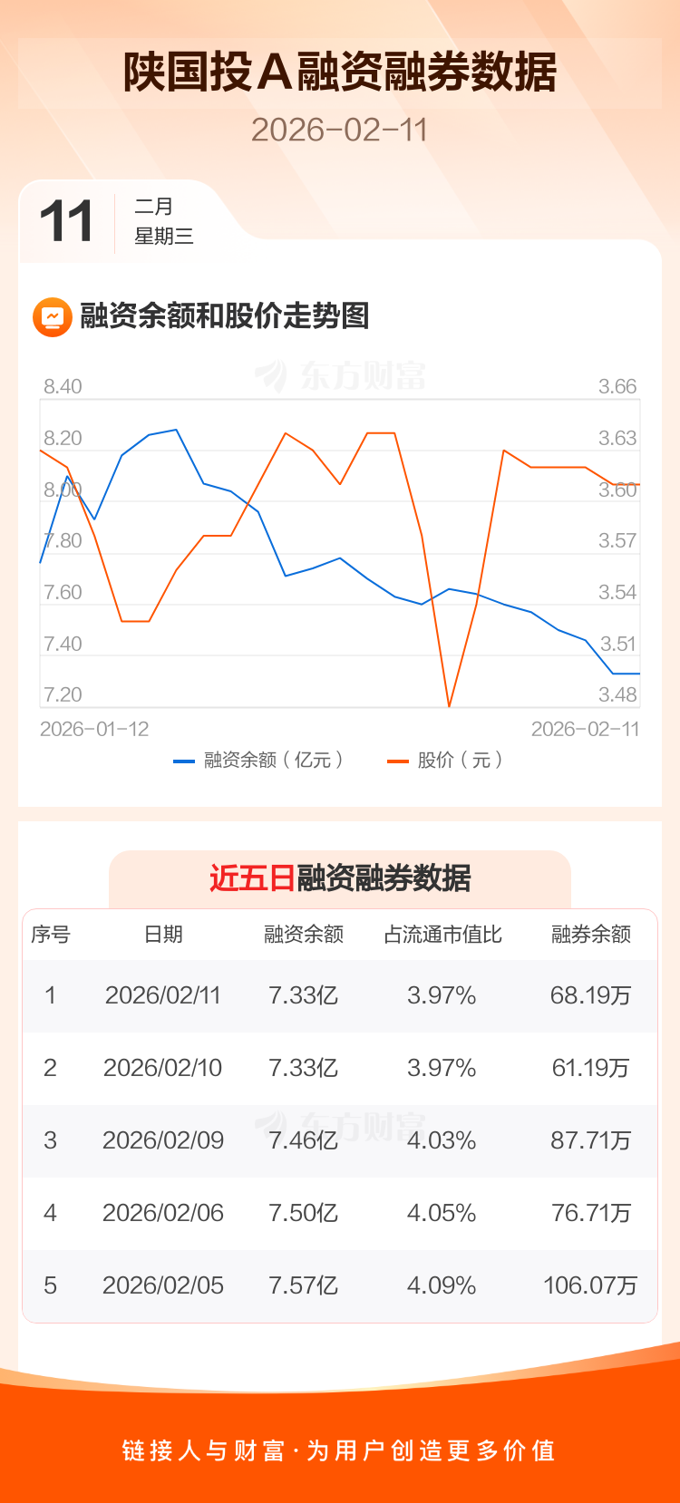 交易所最新数据显示,陕国投A于2026年2月11日获融资买入3842.50万元,融资偿还3797.93万元,当日融资净买入44.56万元。目前,该股融资余额7.33亿,占流通市值比例为3.97%。