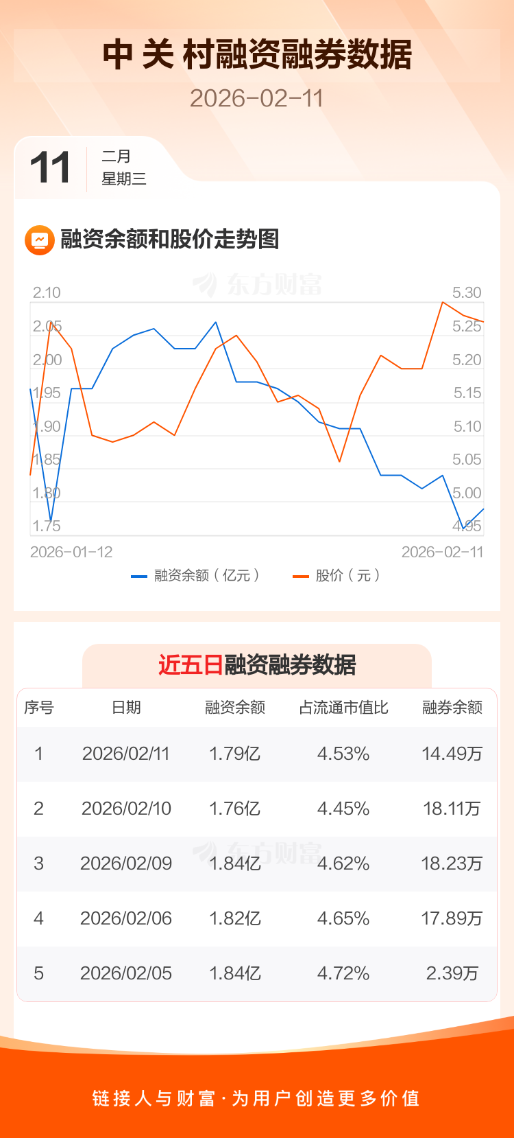 交易所最新数据显示,中 关 村于2026年2月11日获融资买入760.11万元,融资偿还483.06万元,当日融资净买入277.06万元。目前,该股融资余额1.79亿,占流通市值比例为4.53%。