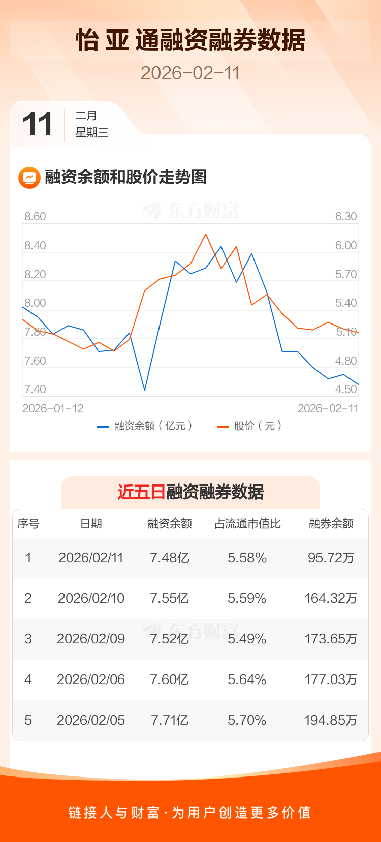 交易所最新数据显示,怡 亚 通于2026年2月11日获融资买入2516.13万元,融资偿还3171.16万元,当日融资净偿还655.03万元。目前,该股融资余额7.48亿,占流通市值比例为5.58%。