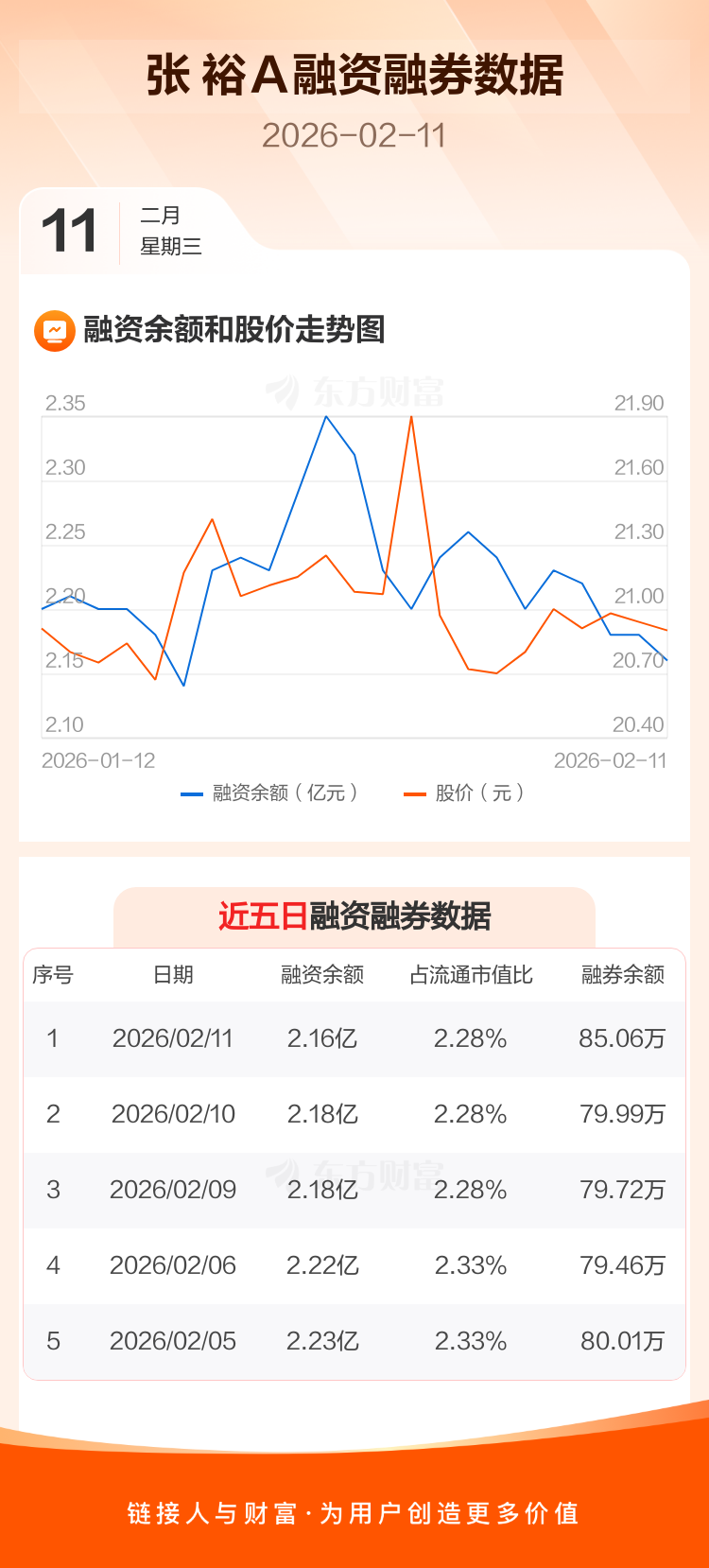 交易所最新数据显示,张 裕A于2026年2月11日获融资买入126.07万元,融资偿还250.48万元,当日融资净偿还124.41万元。目前,该股融资余额2.16亿,占流通市值比例为2.28%。