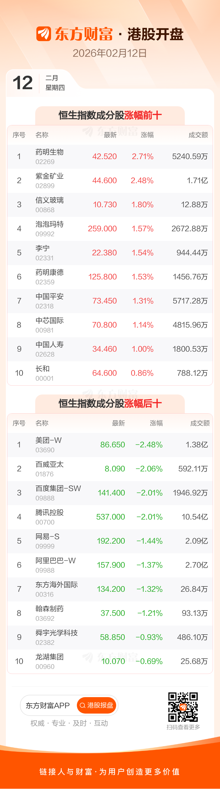 港股2月12日低开,恒生指数开盘报27210.56点,跌55.82点,跌幅0.2%;恒生科技指数开盘报5474.25点,跌25.74点,跌幅0.47%。恒生指数成分股中药明生物、紫金矿业、信义玻璃涨幅居前,美团-W、百威亚太、百度集团-SW跌幅靠前。恒生科技指数成分股中中芯国际、零跑汽车、比亚迪股份涨幅居前,美团-W、百度集团-SW、腾讯控股跌幅靠前。