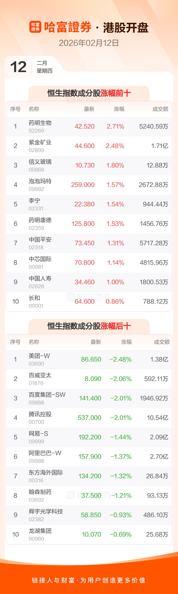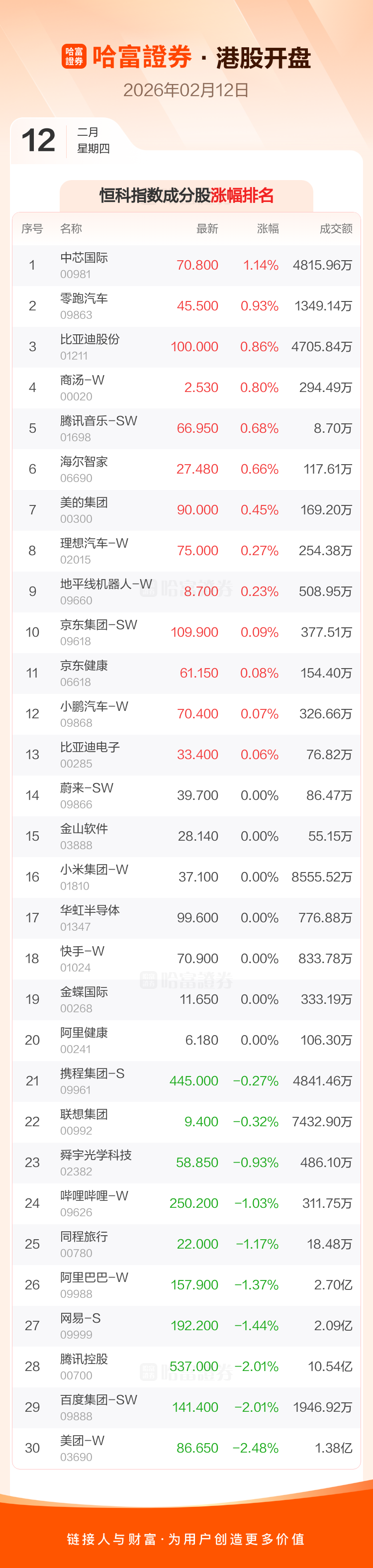 港股2月12日低开 ,恒生指数开盘报27210.56点,跌55.82点,跌幅0.2%;恒生科技指数开盘报5474.25点,跌25.74点,跌幅0.47%。恒生指数成分股中药明生物、紫金矿业、信义玻璃涨幅居前,美团-W、百威亚太、百度集团-SW跌幅靠前。恒生科技指数成分股中中芯国际、零跑汽车、比亚迪股份涨幅居前,美团-W、百度集团-SW、腾讯控股跌幅靠前。