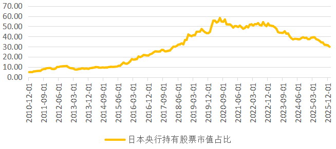 最后,日本股市主要购买方还包括日本央行,这是日本股市上涨的重要驱动力。截至2026年1月,日本政府通过日本央行和政府养老金投资基金等机构持有的日本股票规模为371.8万亿日元,占东京证券交易所总市值的29.8%,这一比例在2020年日本央行实施质化量化宽松(QEE)政策时一度攀升至56.8%。