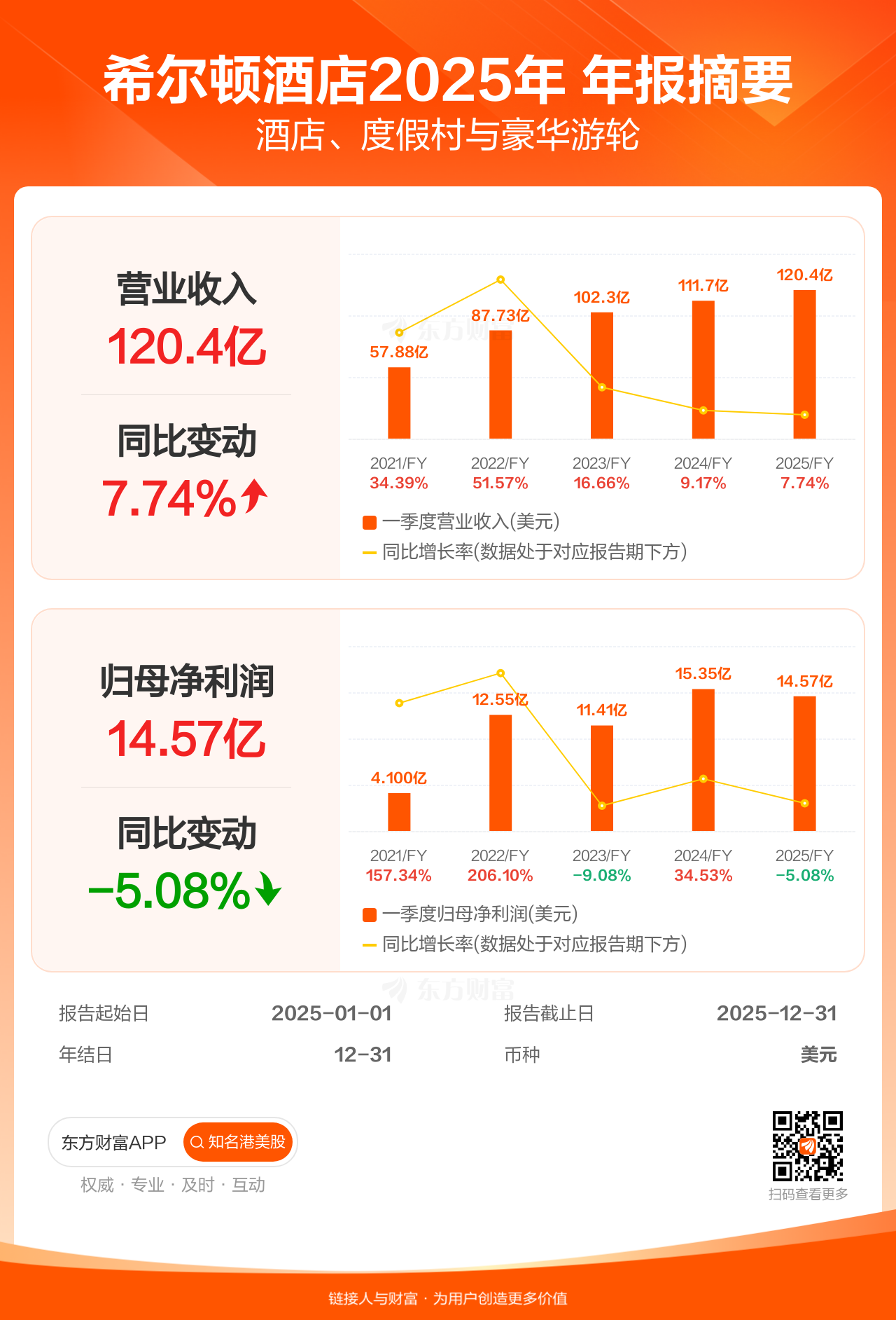 希尔顿酒店2月11日发布年报业绩,截至2025年12月31日的12个月内,该公司营业收入120.39亿美元,同比增长7.74%;公司权益持有人应占溢利(归母净利润)14.57亿美元,同比减少5.08%。