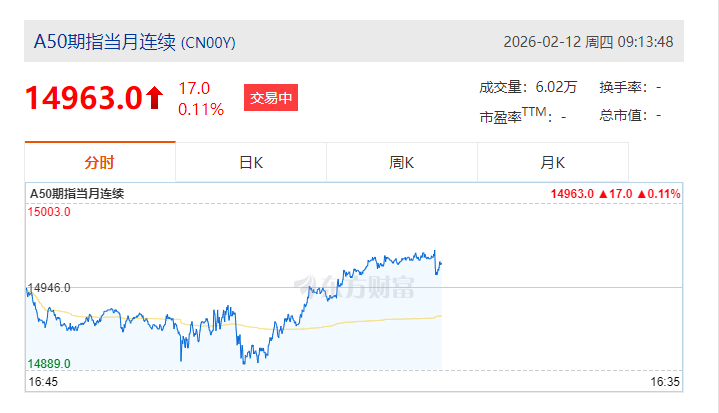 上证报中国证券网讯 2月12日,富时中国A50指数期货在上一个交易日夜盘收涨0.15%的基础上高开,截至9时13分,主力合约涨0.11%。