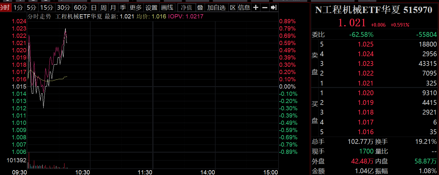 截至今日上午10时07分,工程机械ETF华夏交出了首份成绩单:成交额近1亿元,最新价格1.021元,上涨0.59%。在近期市场板块轮动加快的背景下,这只新产品能够实现近亿元的半日成交,足见资金对这一细分赛道的关注热度。