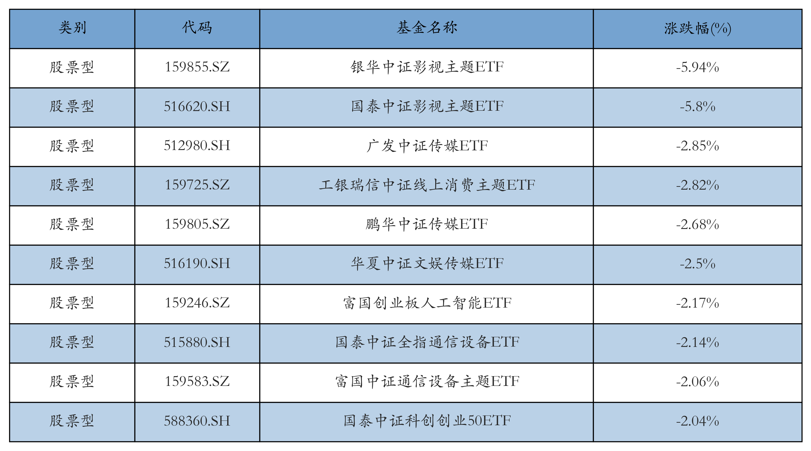 昨日股票型ETF跌幅最大的3只ETF及其收益率分别为:银华中证影视主题ETF(-5.94%)、国泰中证影视主题ETF(-5.8%)、广发中证传媒ETF(-2.85%)。跌幅前10详情见下表:
