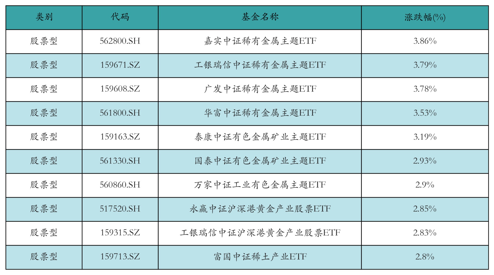 昨日股票型ETF涨幅最高的3只ETF及其收益率分别为:嘉实中证稀有金属主题ETF(3.86%)、工银瑞信中证稀有金属主题ETF(3.79%)、广发中证稀有金属主题ETF(3.78%)。涨幅前10详情见下表: