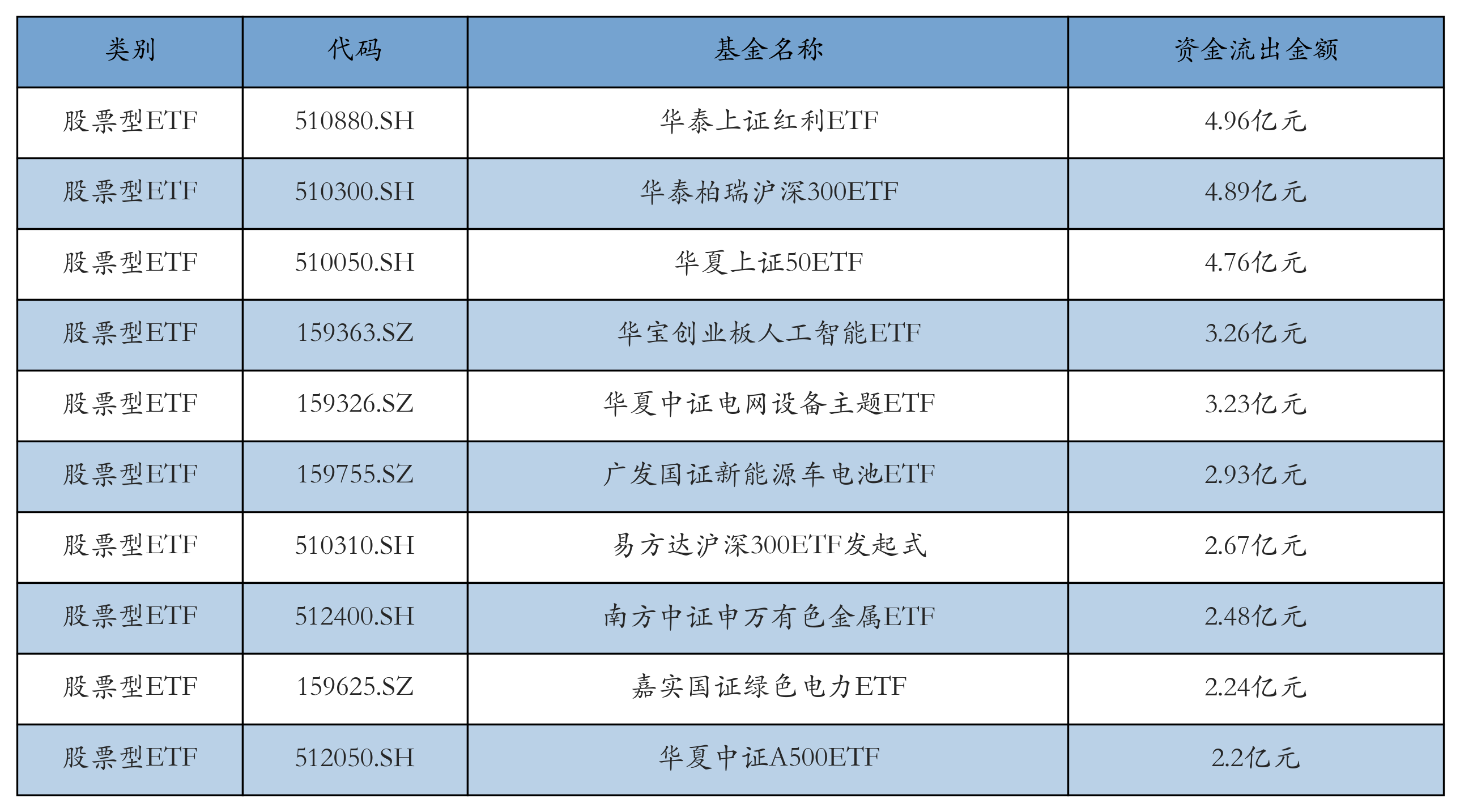 昨日股票型ETF资金流出最多的3只ETF及其流出金额分别为:华泰上证红利ETF(流出4.96亿元)、华泰柏瑞沪深300ETF(流出4.89亿元)、华夏上证50ETF(流出4.76亿元)。资金流出前10详情见下表: