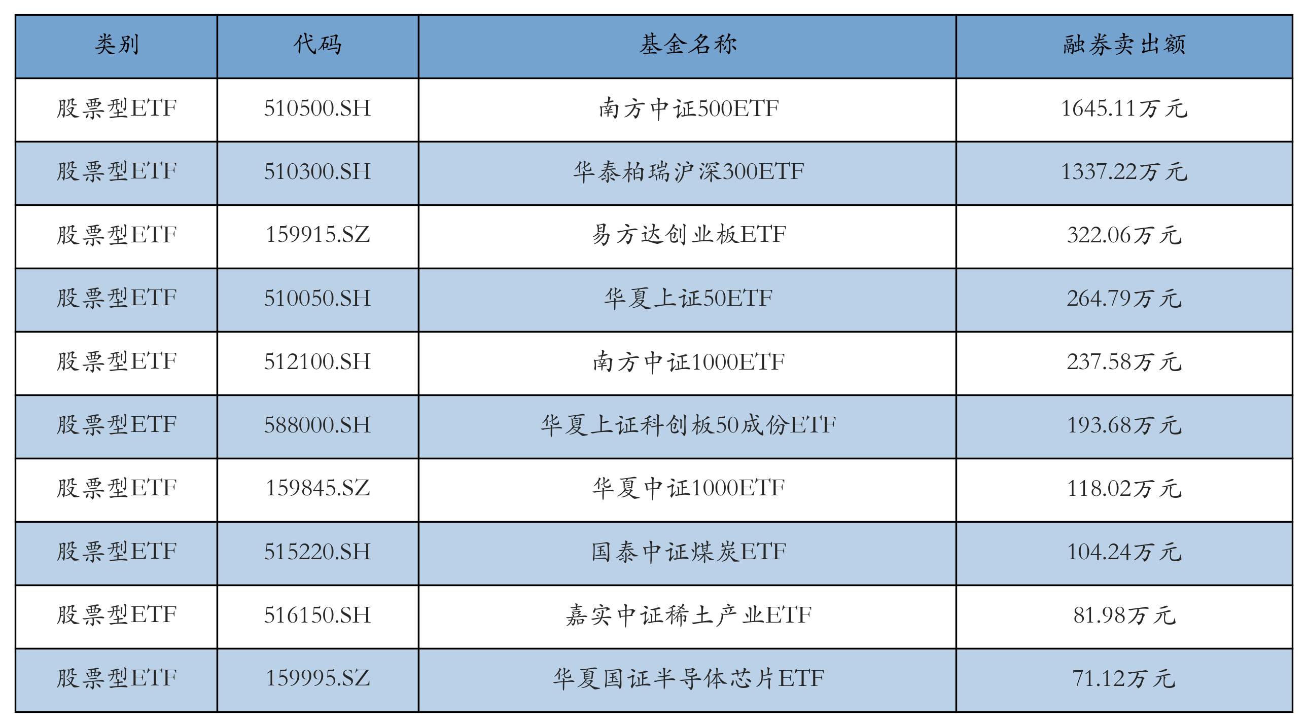 昨日股票型ETF融资卖出额最高的3只ETF及其卖出金额分别为:南方中证500ETF(1645.11万元)、华泰柏瑞沪深300ETF(1337.22万元)、易方达创业板ETF(322.06万元)。融券卖出额前10详情见下表: