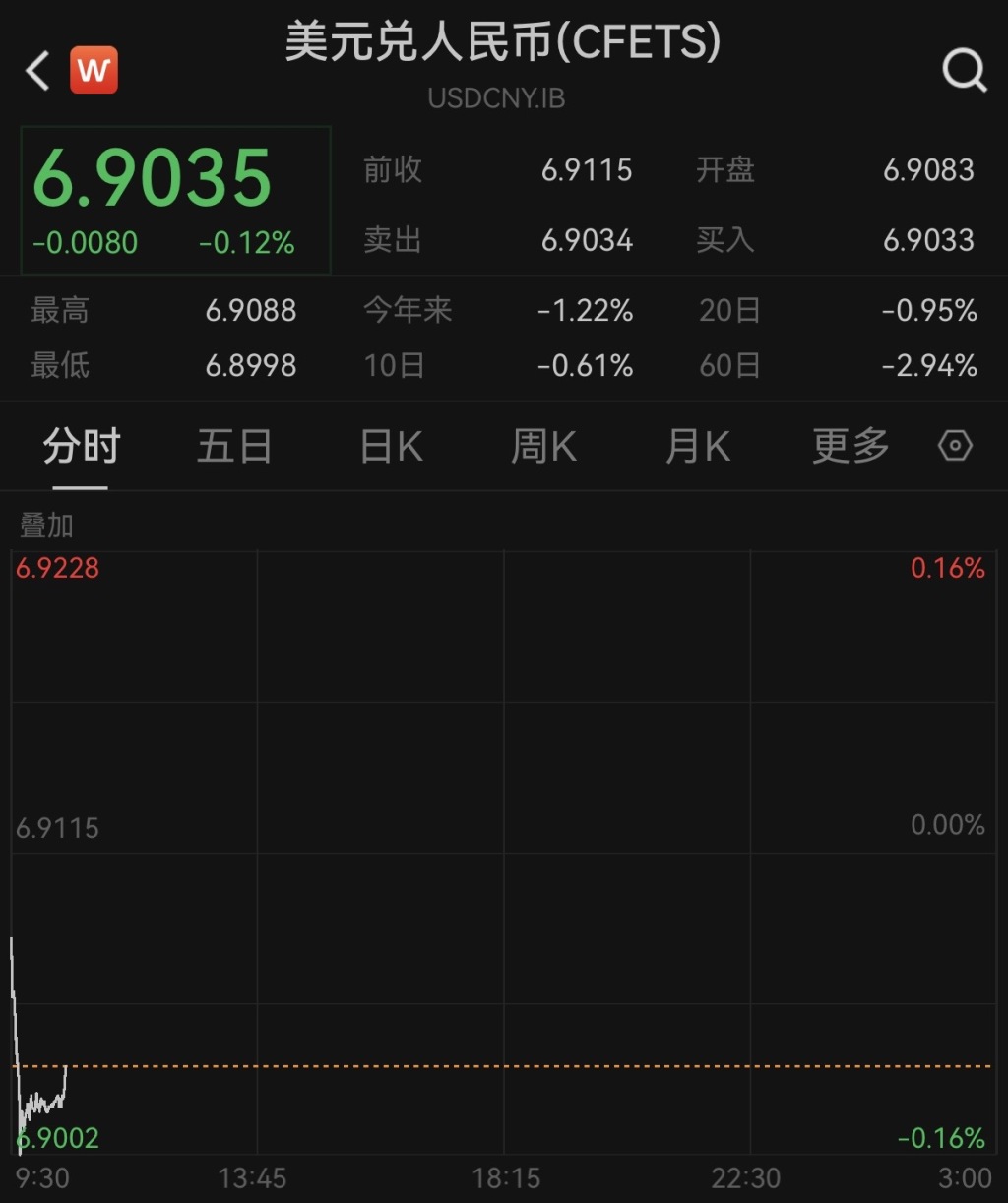 人民币对美元汇率在离岸市场同样升破6.90关口。