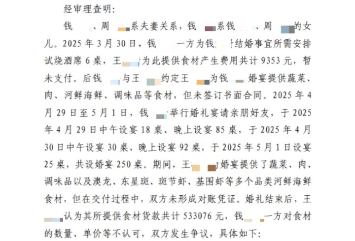 根据判决书,王老板要求钱老板一方支付海鲜、猪肉、蔬菜等食材费用一共534565元。钱老板一方认为,婚礼当天,王老板从未向该指定人员交货,也没有人验收,王老板确实为婚宴提供了部分食材,可费用已经无法核算,综合考虑应该费用在300000元以下,其愿意认可的金额为270000元。