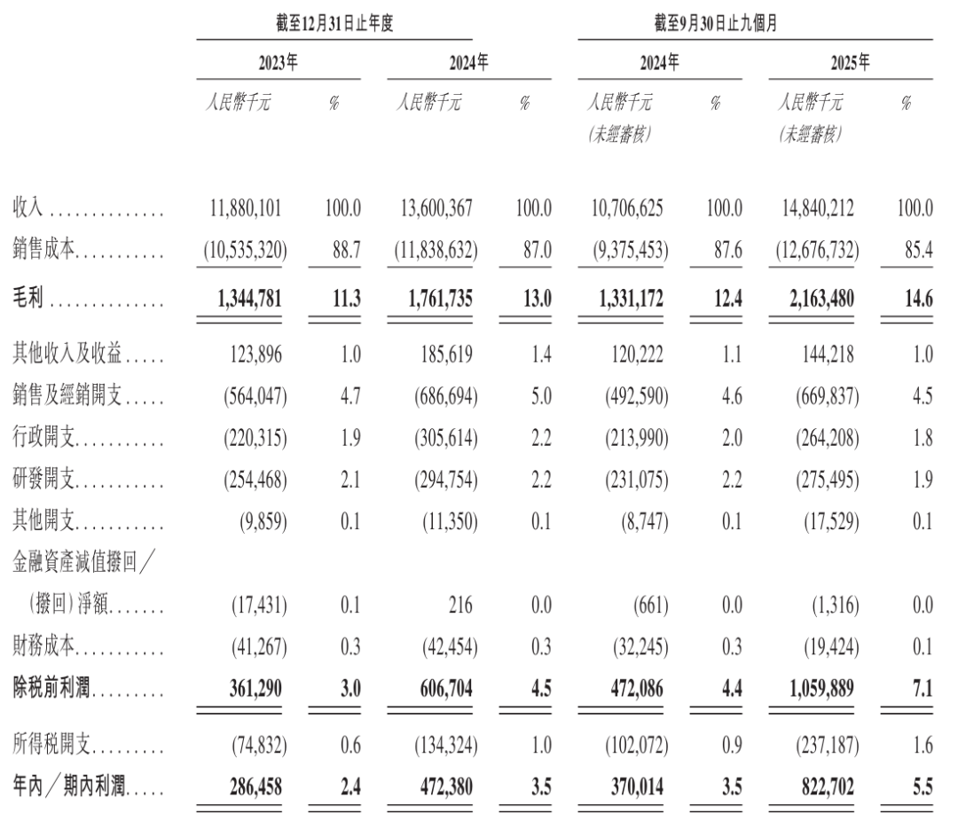 招股书显示,台铃科技2023年、2024年营收分别为118.8亿、136亿元;毛利分别为13.45亿、17.62亿元;期内利润分别为2.86亿、4.72亿元。2025年前9个月营收为148.4亿元,较上年同期的107亿元增长38.7%;毛利为21.63亿元,期内利润为8.23亿元,期内利润率为5.5%。