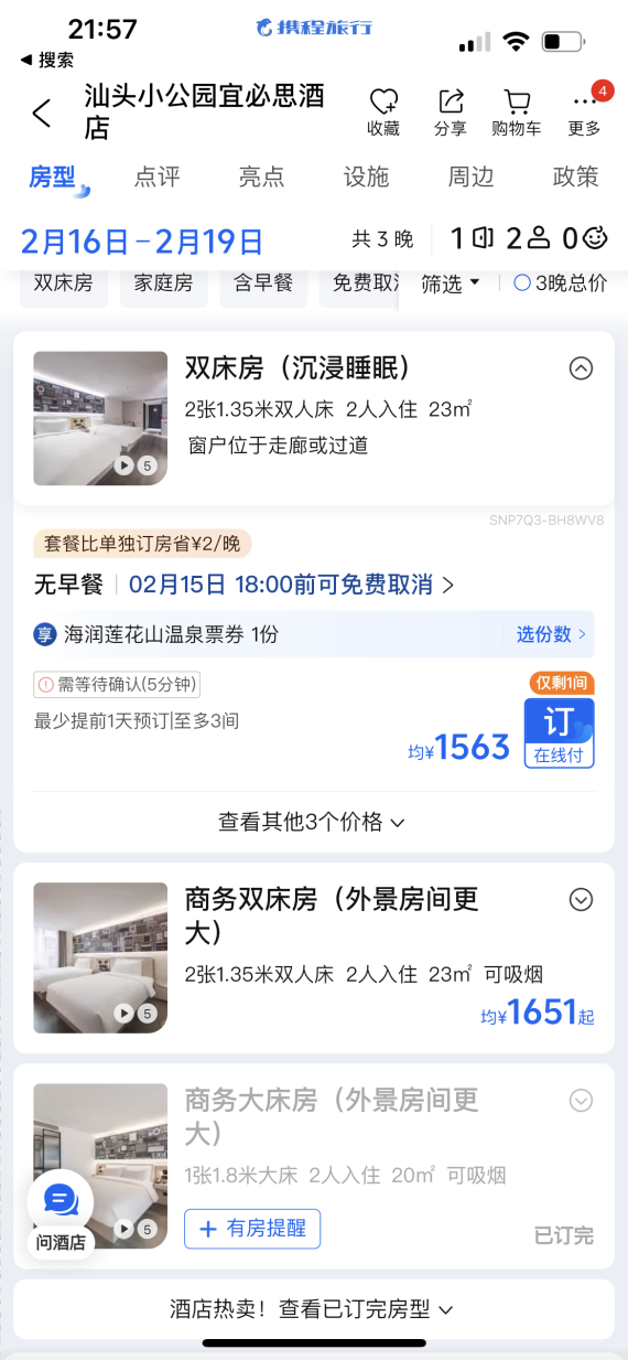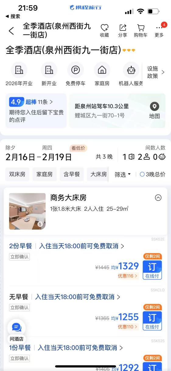 潮汕、泉州等新晋顶流文旅城市,酒店价格直接冲上热搜:平日两三百元的快捷酒店,春节轻松破千;核心景区、商圈附近,一晚两三千元已是常态。