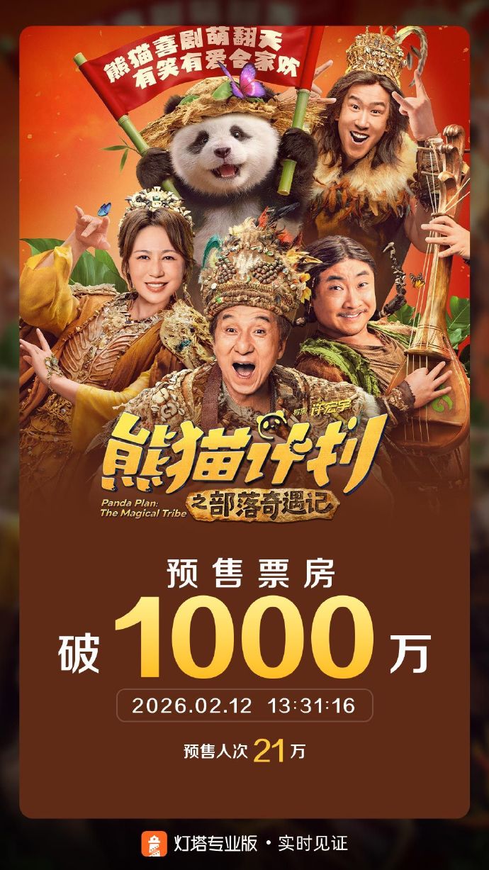 据灯塔专业版实时数据,截至2月12日13时31分,影片《熊猫计划之部落奇遇记》预售总票房突破1000万元。