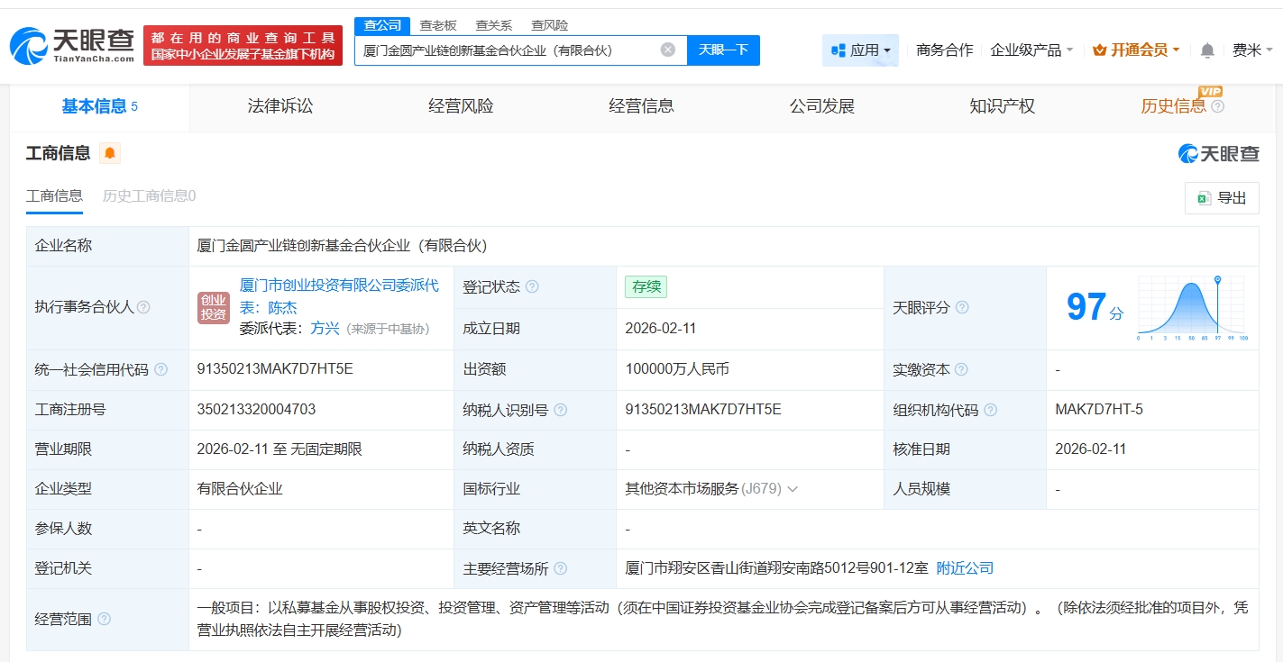 南方财经2月12日电,天眼查App显示,近日,厦门金圆产业链创新基金合伙企业(有限合伙)成立,执行事务合伙人为厦门市创业投资有限公司,出资额10亿人民币,经营范围为以私募基金从事股权投资、投资管理、资产管理等活动,由厦门金圆投资集团有限公司、厦门市创业投资有限公司、厦门市产业投资有限公司、厦门产投新圆科技投资有限公司共同出资。