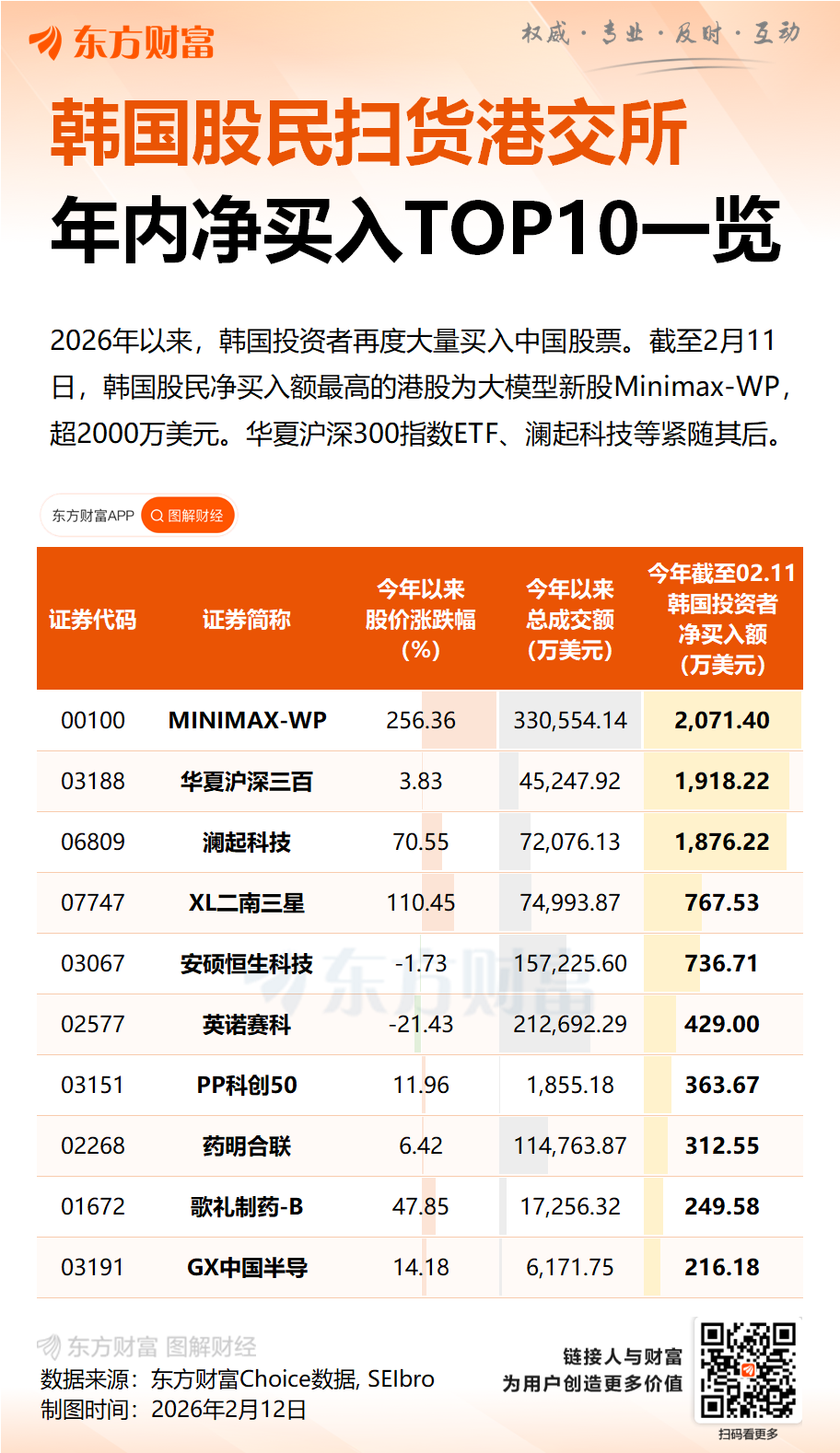韩国预托结算院(KSD)旗下SEIbro数据显示,截至2月10日,在港交所市场上,韩国股民年内买入金额排名前十的分别为MiniMax-WP、华夏沪深300ETF、澜起科技、安硕恒生科技ETF、南方东英每日杠杆三星电子、英诺赛科、Premia中国科创50ETF、药明合联、歌礼制药、Global X中国半导体ETF。