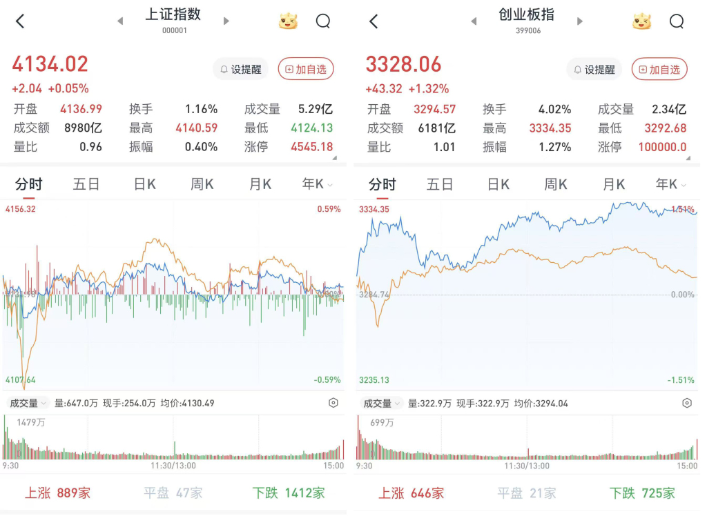 至收盘,上证综指涨0.05%,报4134.02点;科创50指数涨1.78%,报1480.99点;深证成指涨0.86%,报14283点;创业板指涨1.32%,报3328.06点。