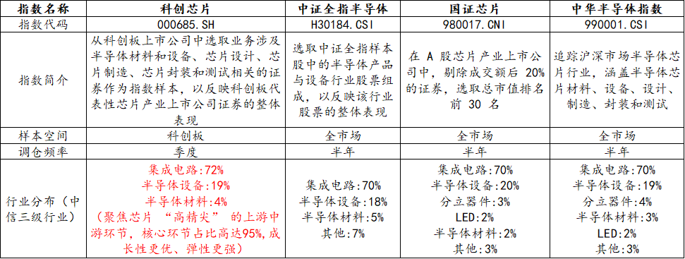 市场上芯片相关指数众多,选取当下热门的科创芯片、半导体等指数进行比较,可以发现,虽然均聚焦为芯片板块,但在指数编制上却大有不同。一句话总结:科创芯片指数聚焦芯片核心环节,“含芯量”更高,弹性强,成长性高。