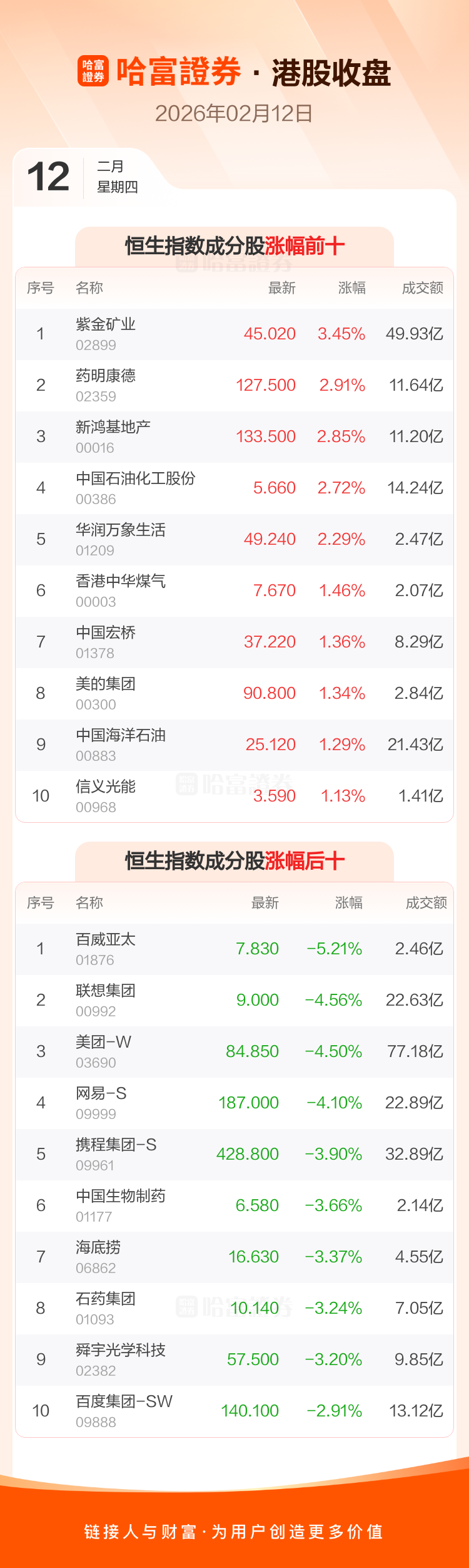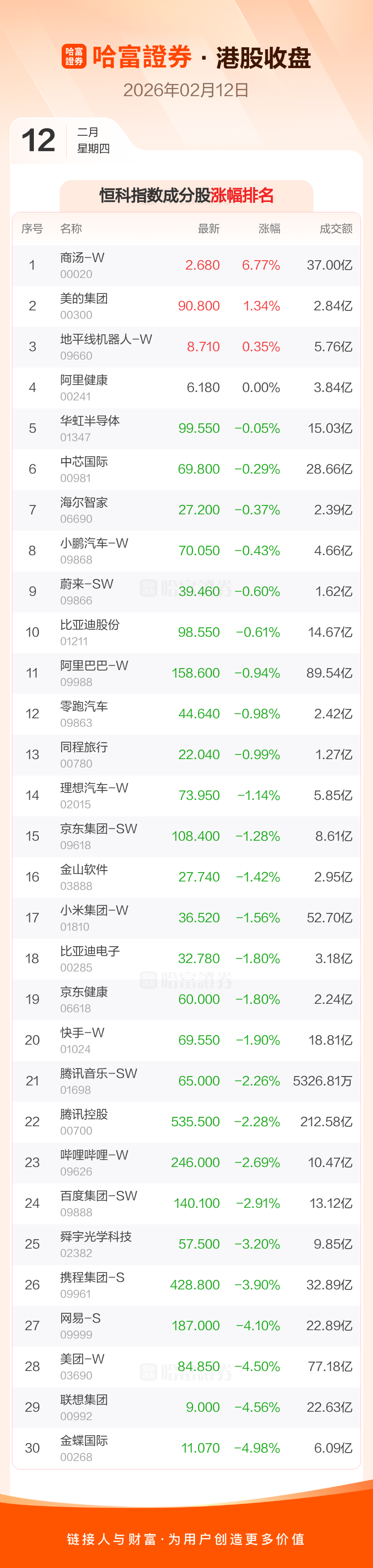 港股2月12日收盘走低,恒生指数收报27032.54点,跌233.84点,跌幅0.86%;恒生科技指数收报5408.98点,跌91.01点,跌幅1.65%。恒生指数成分股中紫金矿业、药明康德、新鸿基地产涨幅居前,百威亚太、联想集团、美团-W跌幅靠前。恒生科技指数成分股中商汤-W、美的集团、地平线机器人-W涨幅居前,金蝶国际、联想集团、美团-W跌幅靠前。