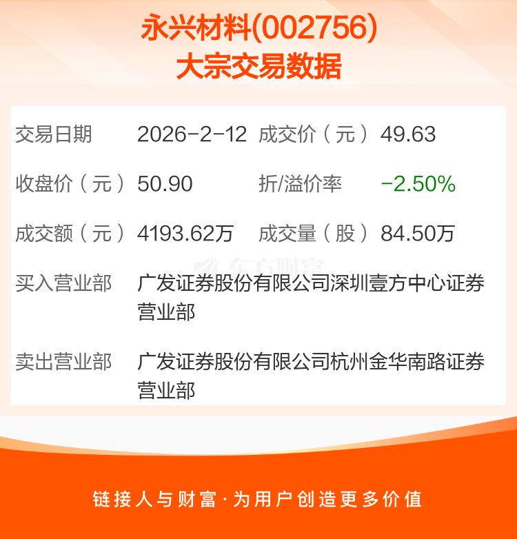 2026年2月12日,永兴材料发生1笔大宗交易,共成交84.50万股,成交金额4193.62万元,占其流通市值比例为0.21%。