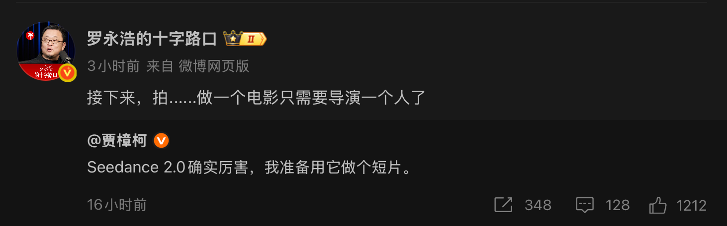 导演贾樟柯也在个人微博账号发文称:“Seedance 2.0确实厉害,我准备用它做个短片。 ”罗永浩转发该内容并表示:接下来,做一部电影只需要导演一个人了。