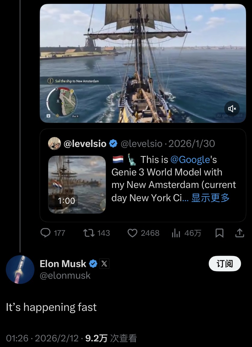 2月12日,面对连日刷屏的Seedance 2.0生成视频,埃隆·马斯克(Elon Musk)在社交平台上点评。