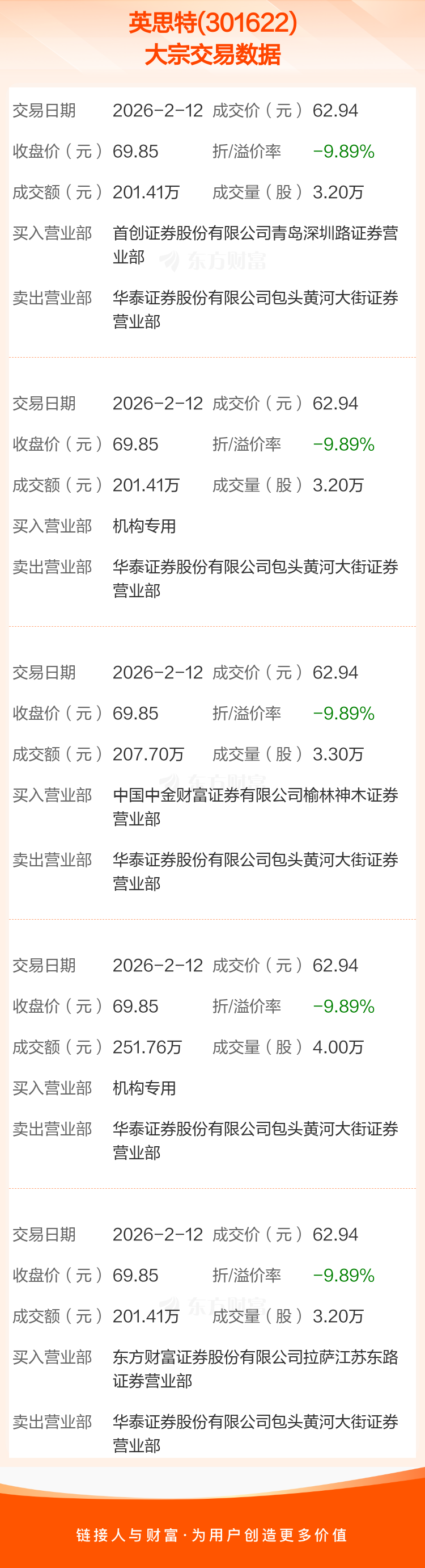 5笔大宗交易成交均价62.94元,较该股当日收盘价69.85元折价9.89%。