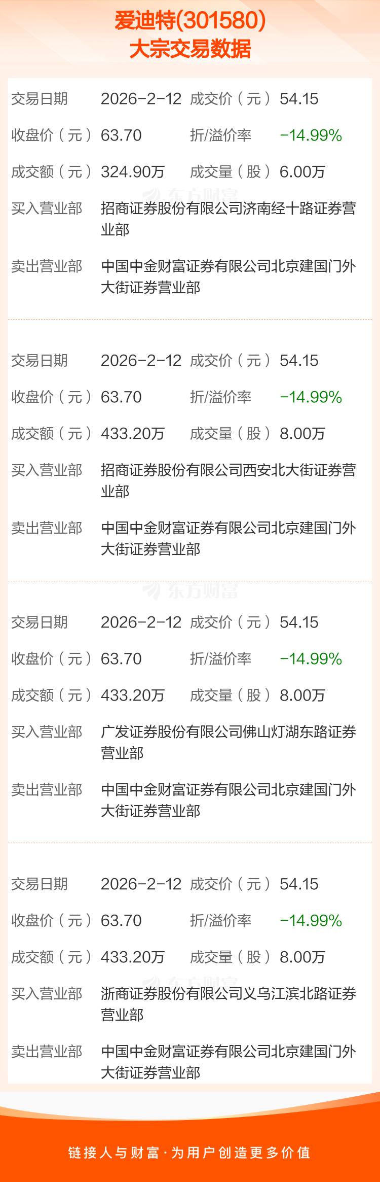 2026年2月12日,爱迪特发生4笔大宗交易,共成交30.00万股,成交金额1624.50万元,占其流通市值比例为0.35%。