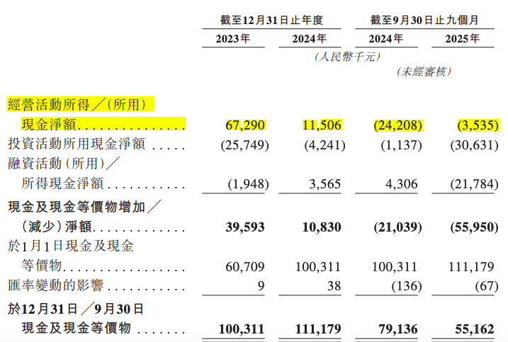 对此,公司在风险因素中直言不讳:“我们于截至2024年及2025年9月30日止九个月录得经营现金流出净额,且我们日后或持续出现经营现金流出净额的情况。”
