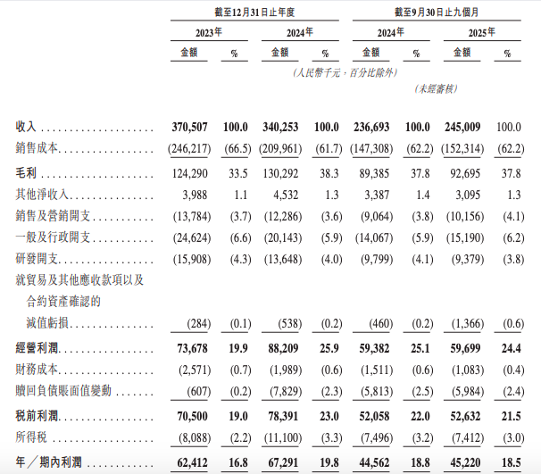 业绩方面,博纳西亚在2023年度、2024年度、2024年前三季度及2025年前三季度分别录得收入约为3.71亿元、3.40亿元、2.37亿元、2.45亿元;同期净利润分别为6241.2万元、6729.1万元、4456.2万元、4522万元。