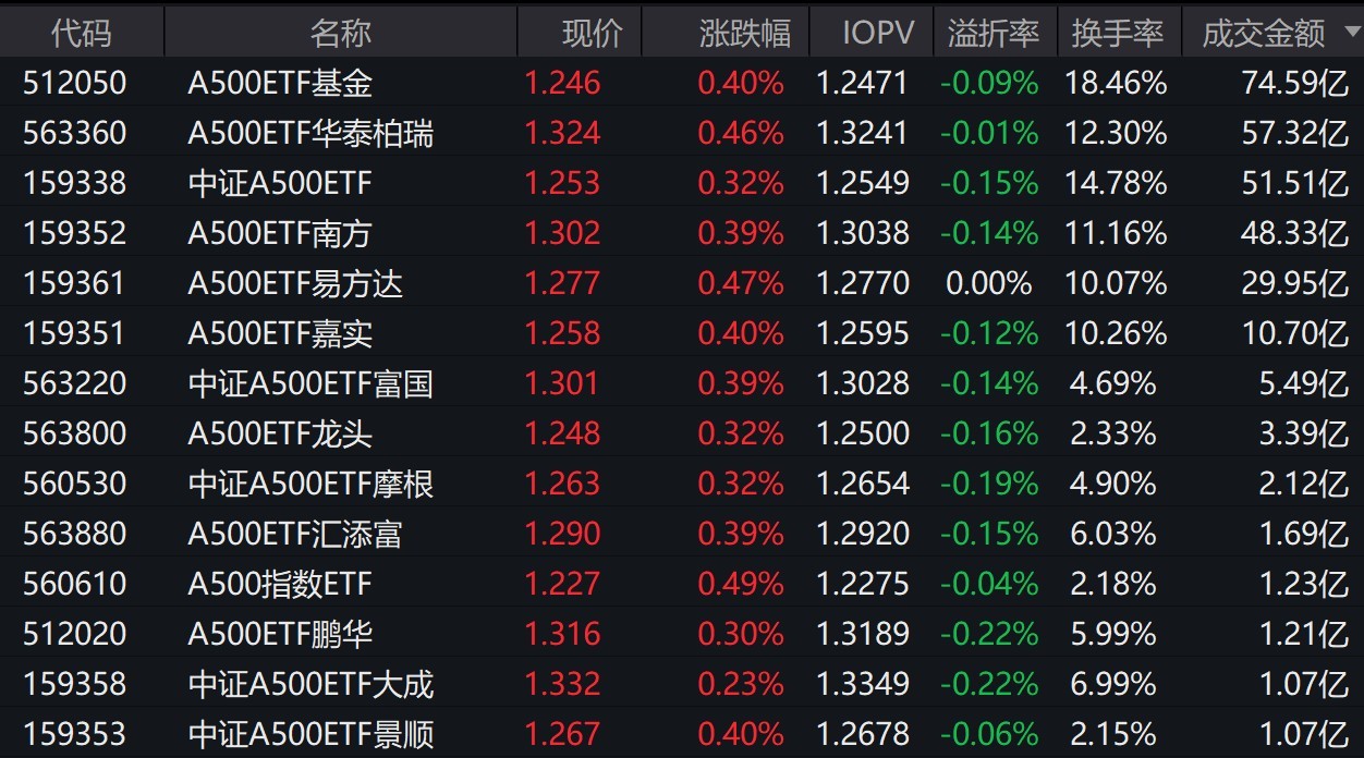 截至上午收盘,场内跟踪中证A500指数的ETF小幅上涨。其中,有14只中证A500相关ETF成交额超1亿元,2只超57亿元。A500ETF基金、A500ETF华泰柏瑞早盘成交额分别为74.59亿元、57.32亿元。