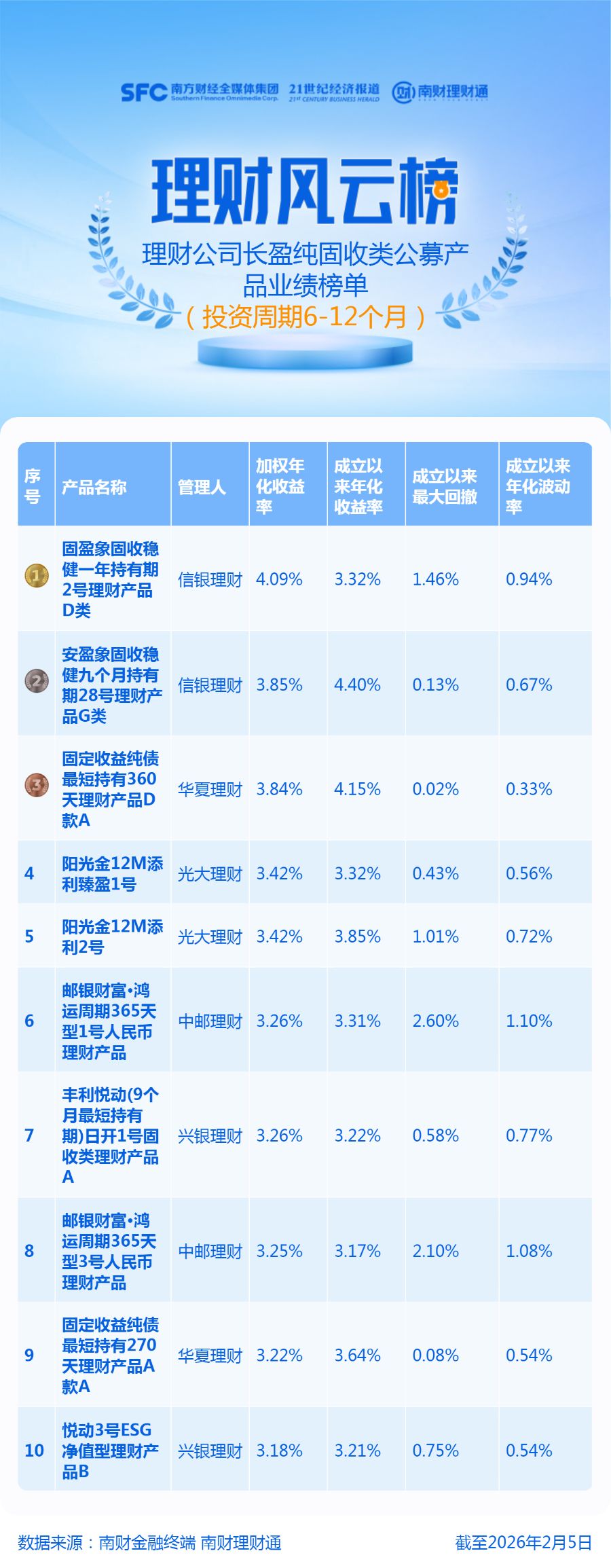 本期榜单统计对象为理财公司发行的成立满1年的公募纯固收产品,投资周期为6—12个月(含)期限,同系列同投资周期产品保留一只,加权平均收益率计算方式为“5%近1月年化收益率+10%近3月年化收益率+15%近6月年化收益率+30%近1年年化收益率+40%成立以来年化收益率”,排名依据为加权年化收益率,数据计算截止时间为2026年2月5日。