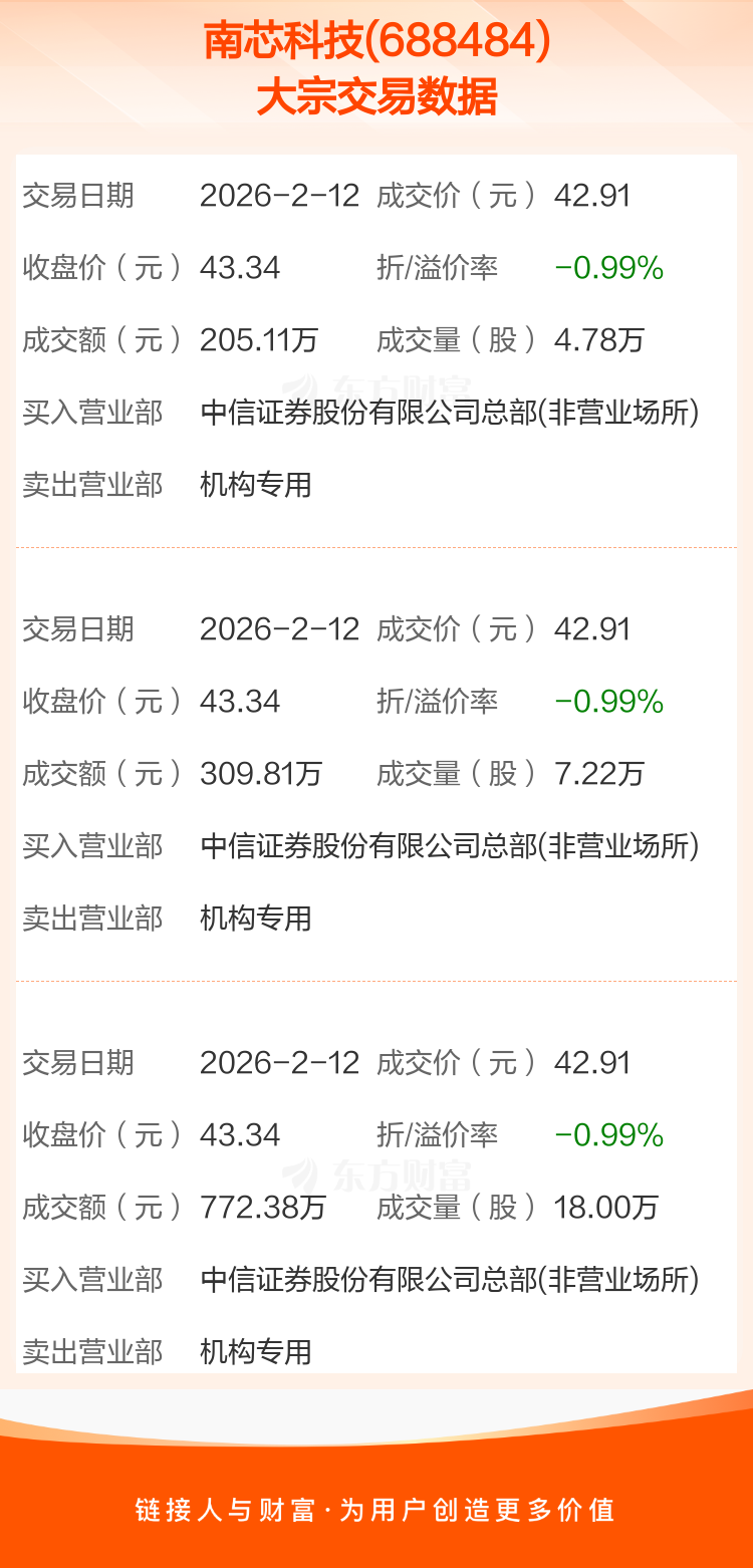 2026年2月12日,南芯科技发生3笔大宗交易,共成交30.00万股,成交金额1287.30万元,占其流通市值比例为0.10%。